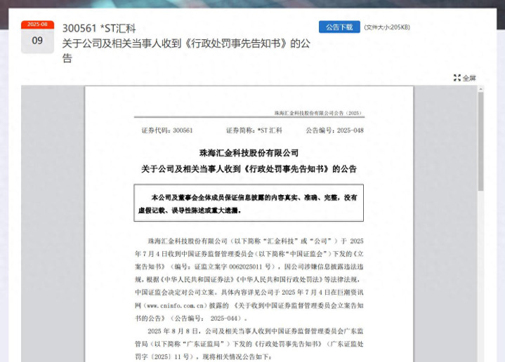 珠海汇金科技股份有限公司(股票简称:*ST汇科、汇金科技,股票代码:300561)于 2025年8月8日晚发布收到证监会《行政处罚事先告知书》(广东证监处罚字〔2025〕11号)的公告,广东证监局认为公司涉嫌2024 年度业绩预告存在误导性陈述,拟决定对*ST汇科给予警告,处以200万元的罚款,并对相关责任人给予警告罚款。