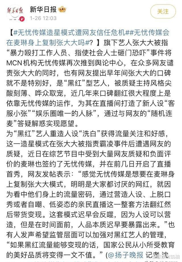 张大大这回怕是难以脱身了,官媒都出面发声了。《新华日报》的文章措辞尖锐,直捣“黑红”艺人这一现象,还把张大大背后的运营公司无忧给揪了出来,严厉批判该公司为“黑红”艺人打造人设、助力其“洗白”,毫无底线地赚取流量。